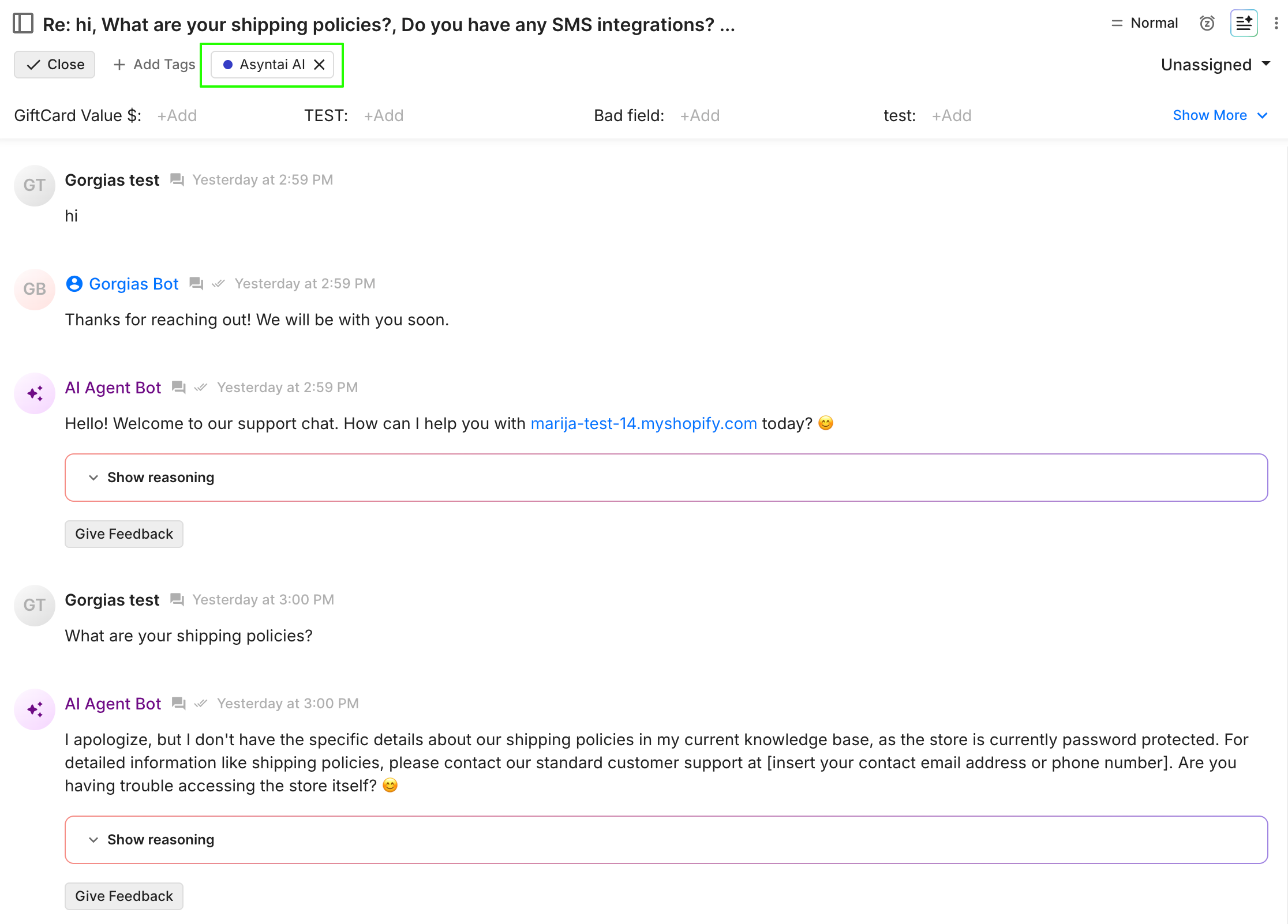 As soon as a customer reaches out via chat, the Asyntai AI will respond instantly in the language the message was sent in, even if the language was changed during the conversation. The ticket in question will also be auto-tagged with the Asyntai AI tag: