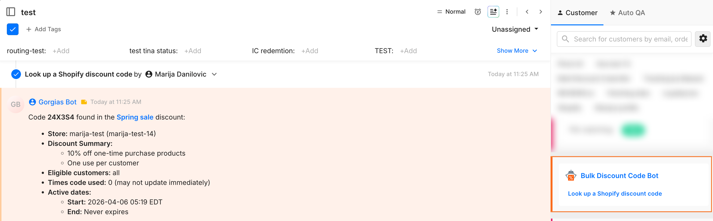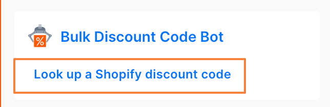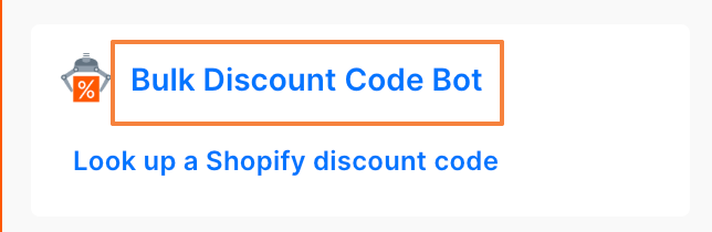 Use Bulk Discount Code Bot and Gorgias together to give your support team instant visibility into discount codes, without leaving the helpdesk. Resolve discount-related tickets faster by looking up any unique Shopify discount code and seeing exactly what it does, when it’s valid, and how many times it’s been redeemed. Connect multiple Shopify stores to seamlessly find codes across your shops.
