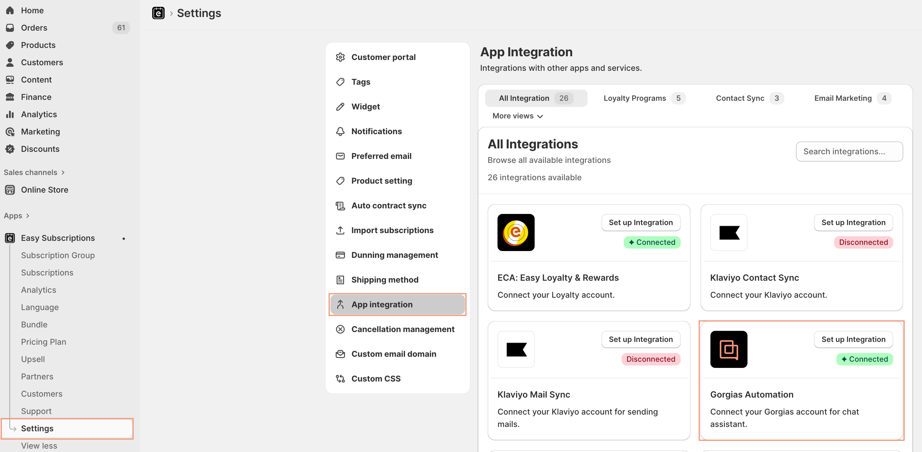 - You will see a page showing a successful connection, and then you’ll be redirected to Shopify. Once there, go to Settings → App Integration → Gorgias: