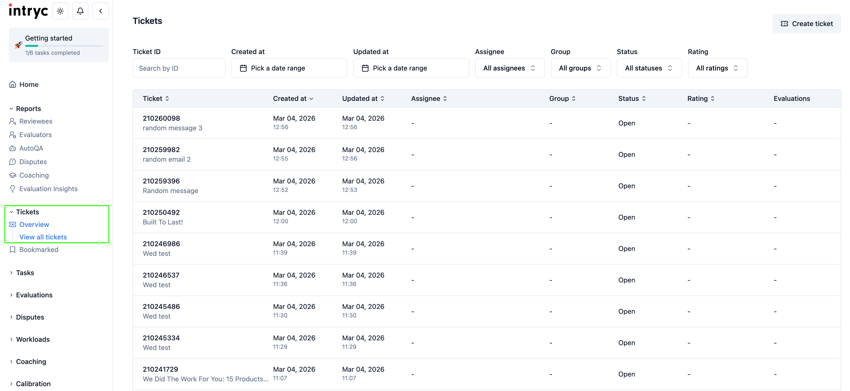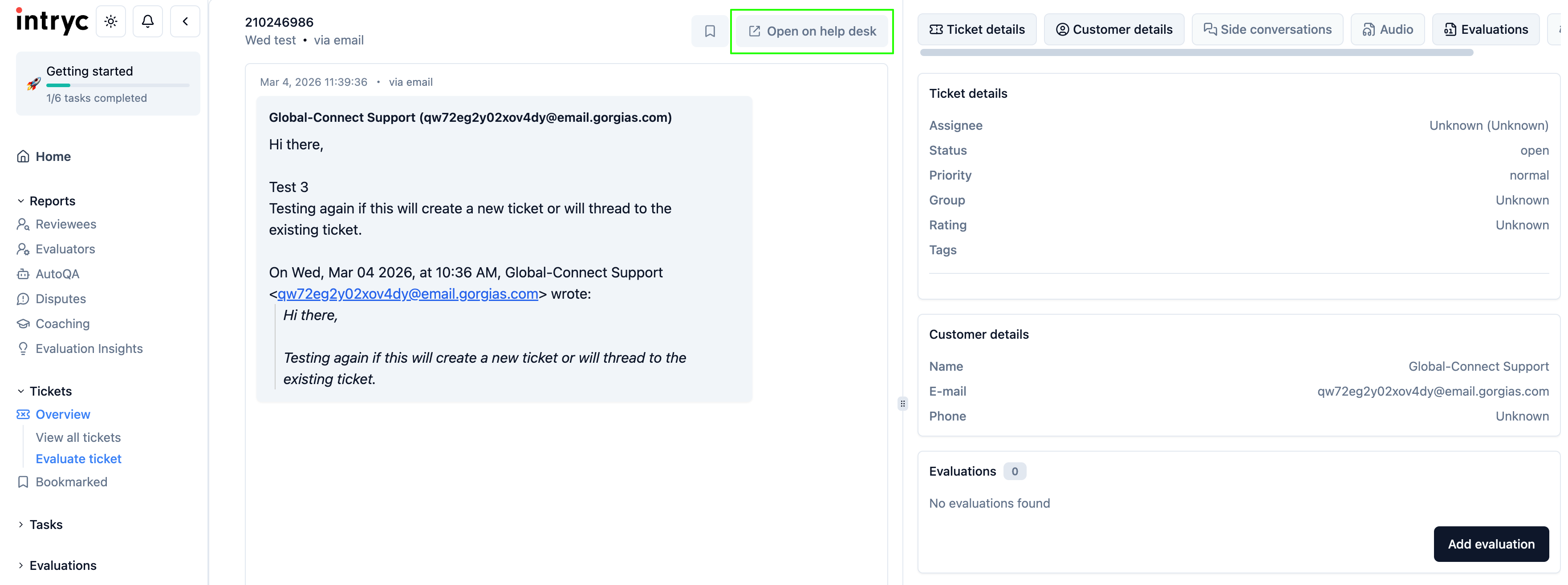 You can select a ticket to view and/or evaluate, and you can also follow the link and open the ticket in Gorgias, and you can also search the Intryc app using the Gorgias ticket ID:.png)