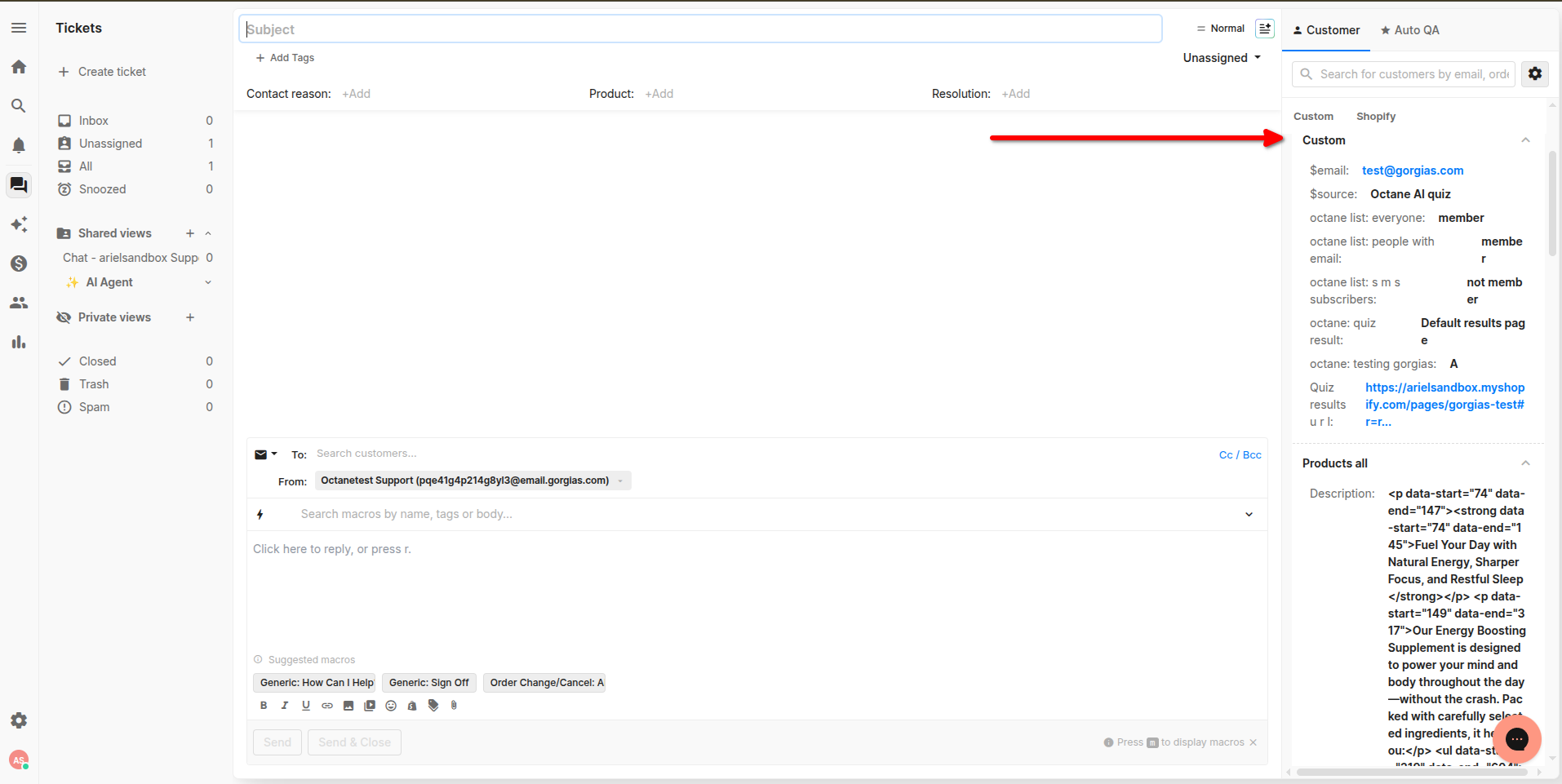 While on your website, customers can utilize the Shopping Assistant and the quiz that was created in Octane, and receive product recommendations, after which that data will be shown in the Gorgias widget:.png)